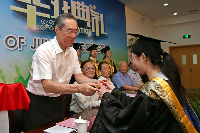 首先,教务处副处长杨延老师宣读《君远学院2015届本科学生毕业资格审核结果》,并由唐英年先生和纪志成校长共同为君远学院毕业生颁发君远荣誉证书。